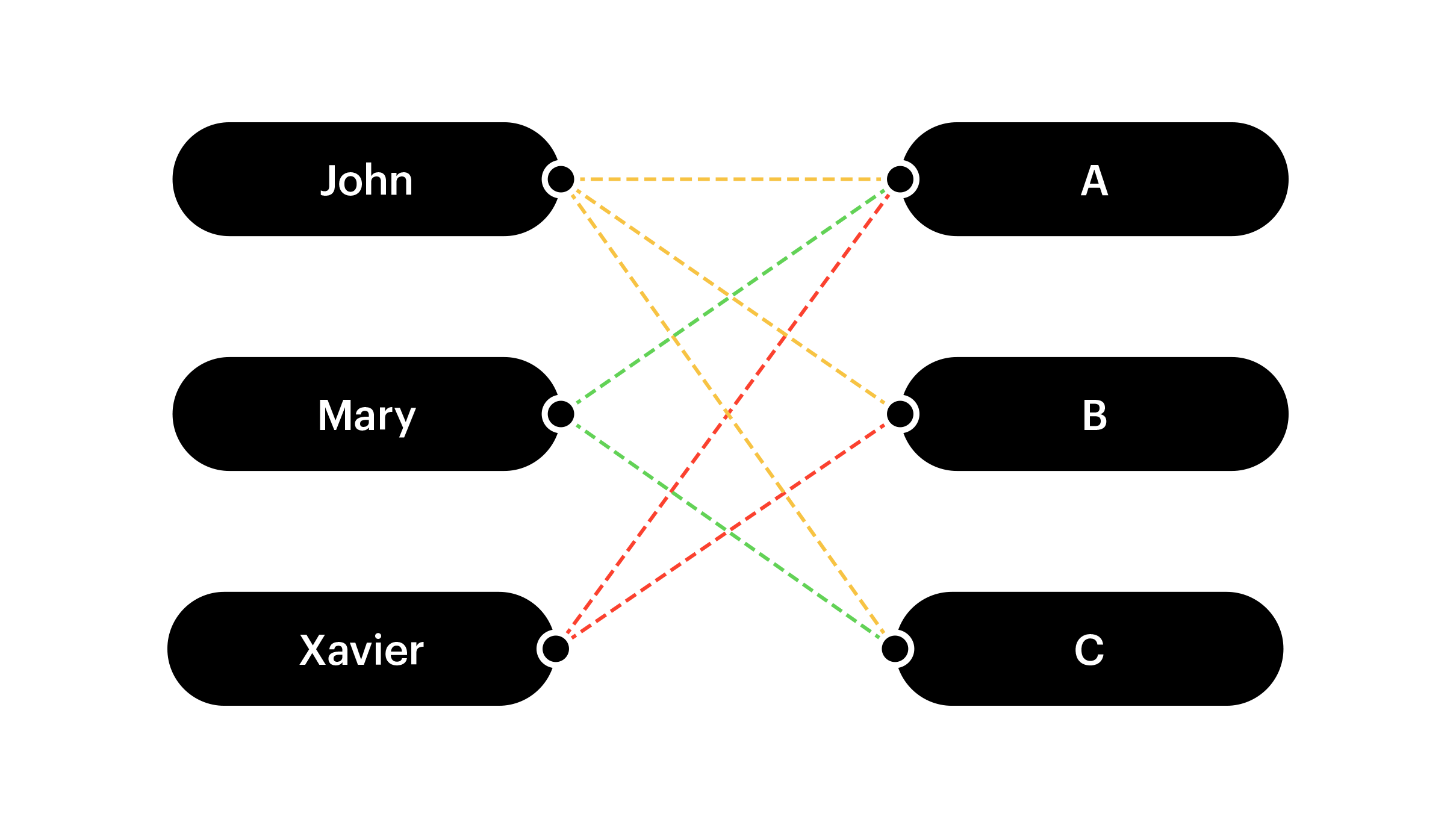 The edges of the graph correspond 1–1 to the rows in the table, e.g. (John , A), (Mary , C).