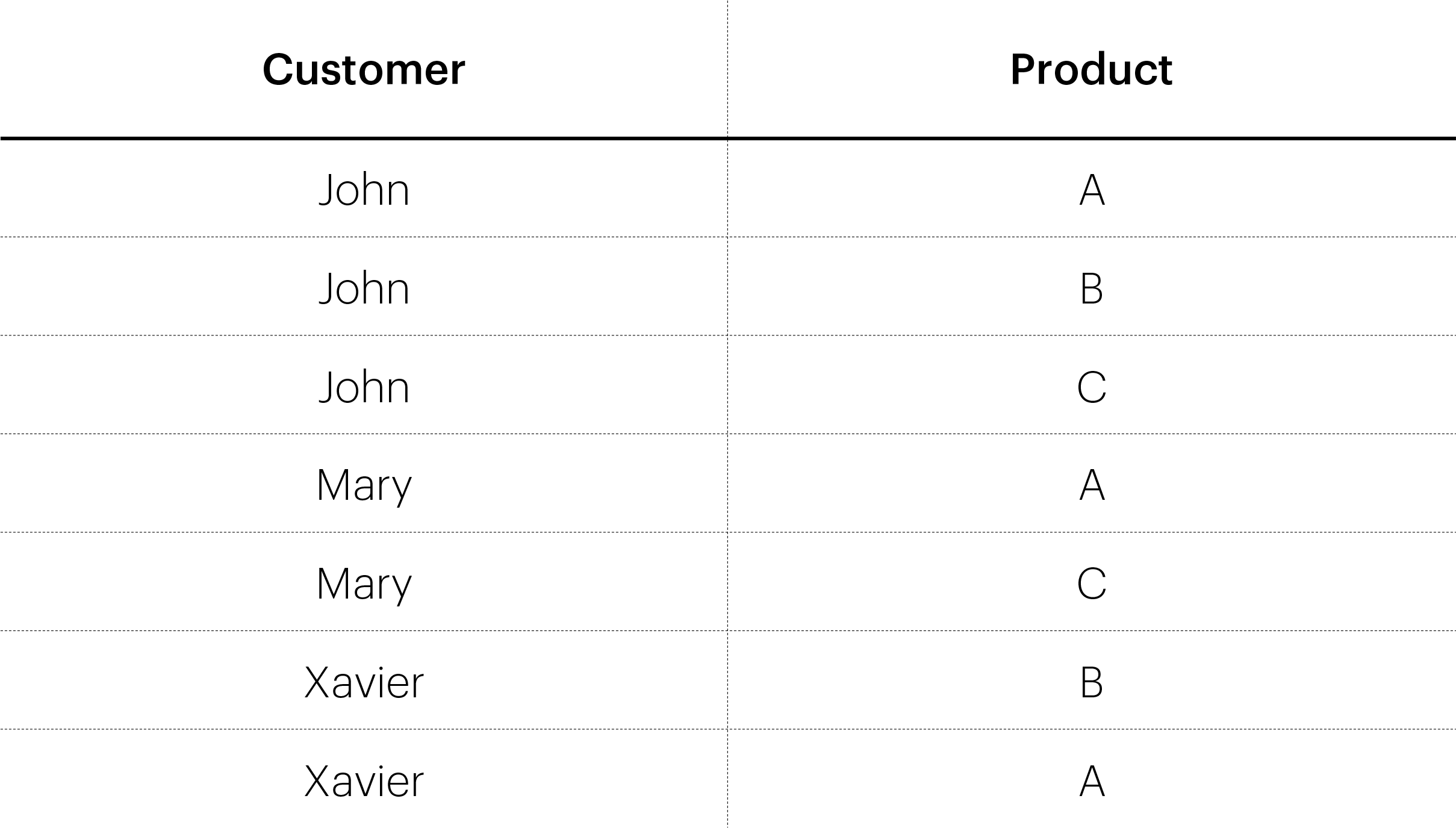 What we did here is — we’ve taken Products (A, B, C) as vertices, and treated Customers (John, Mary, Xavier) as hyperedges. We can think of this as a simple “group by” operation, where we group the Products by the Customers. It may be easier to visualize the hyperedges in the actual table: