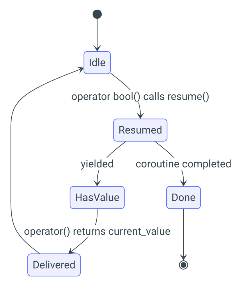 - The operator() method is used to resume the coroutine and get the next value. It also manages the full_ state to prevent multiple resumptions of the coroutine.