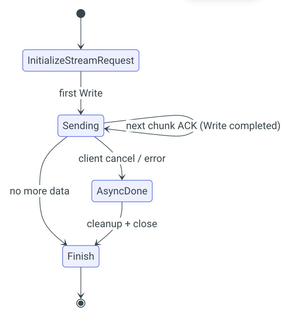 We will extend the previously implemented Handler class by adding a new method, InitializeStreamRequest. This method will create a dedicated StreamContext object responsible for managing the entire streaming process. Since streaming involves more complexity than a single request, we need to handle the following states: Pending, Sending, Finish, and AsyncDone.