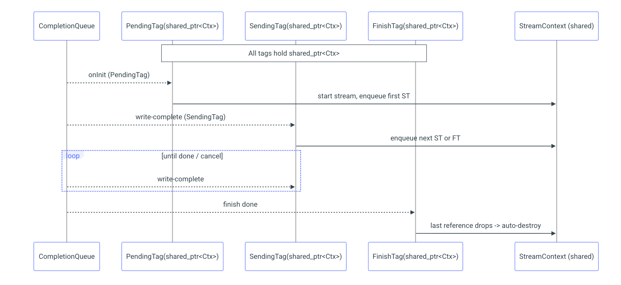 Since we don't want to manually manage the lifetime of objects, we've decided to use a reference-counting mechanism. C++ provides std::shared_ptr, which automatically tracks references to an object and destroys it when the last reference is released. This mechanism is thread-safe, making it ideal for our use case. Each state will be represented by a HandlerTag object, and each tag will hold its own copy of the shared_ptr to the StreamContext. When the last HandlerTag is processed, the request will no longer be in use and will be automatically freed, thanks to the shared_ptr's reference counting and automatic memory management.