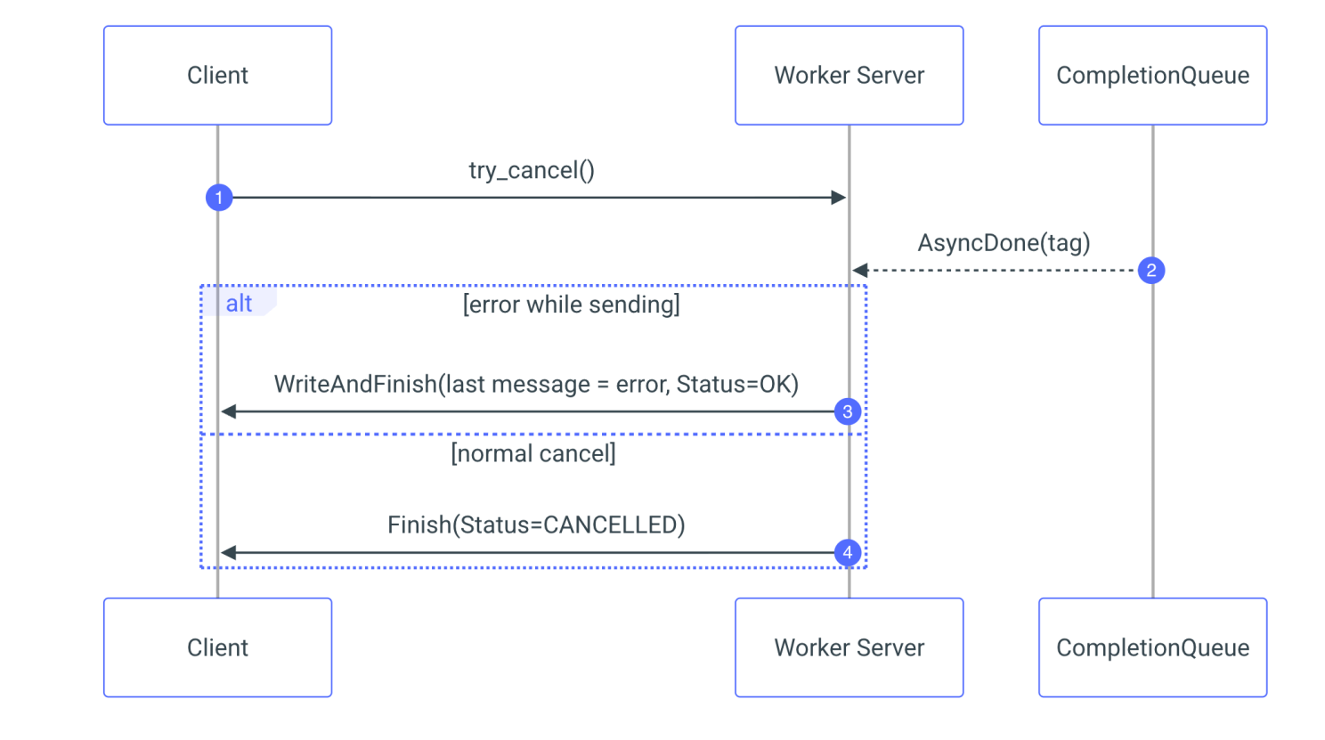 With our server now equipped with a fully asynchronous streaming process, complete with error handling and automatic memory management, we encounter a pivotal question: What happens if the client decides to interrupt the streaming? The client can decide at any moment that it has received all the data and wants to stop the stream. This can be done by calling try_cancel on the clientContext. Once the client interrupts the streaming, the server will receive an AsyncDone tag. At this point, the server should stop sending new chunks and close the stream. This is why we need both AsyncDone and FinishTag: