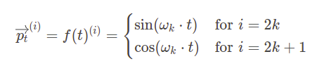 Another good example of this idea is positional encoding in Transformer architecture. Transformer architecture, based on the self-attention mechanism, is primarily used in language processing where word sequences serve as model input. Contrary to Recurrent Neural Networks, which process input tokens one by one, pure Transformers are permutation invariant and do not have information about the positions of input tokens. To add this information, model input is enriched with positional embeddings which encode tokens's position in a sequence. The position is encoded with the following formula, where \(t\) represents a token position in the input sequence, \(p_t\) is a position encoding vector, \(d\) is a vector dimension and \(f\) is a function producing \(p_t\) vector: