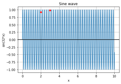 We can see that the lower frequency function will react to this change in the lower degree and the higher frequency function will capture this change better. By combining functions with different frequencies we represent different levels of sensitivity for changes in input feature value. It may occur that a given function will fail to capture the change in x: