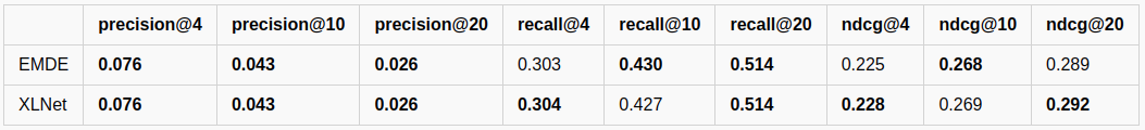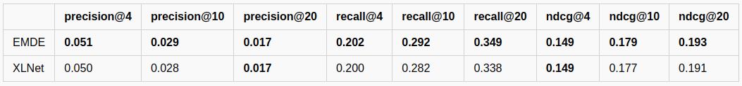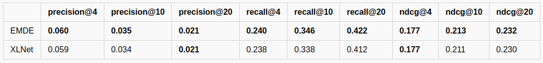 Despite a very simple architecture and short training times, EMDE is a strong competitor - outperforming XLNet on a variety of metrics.