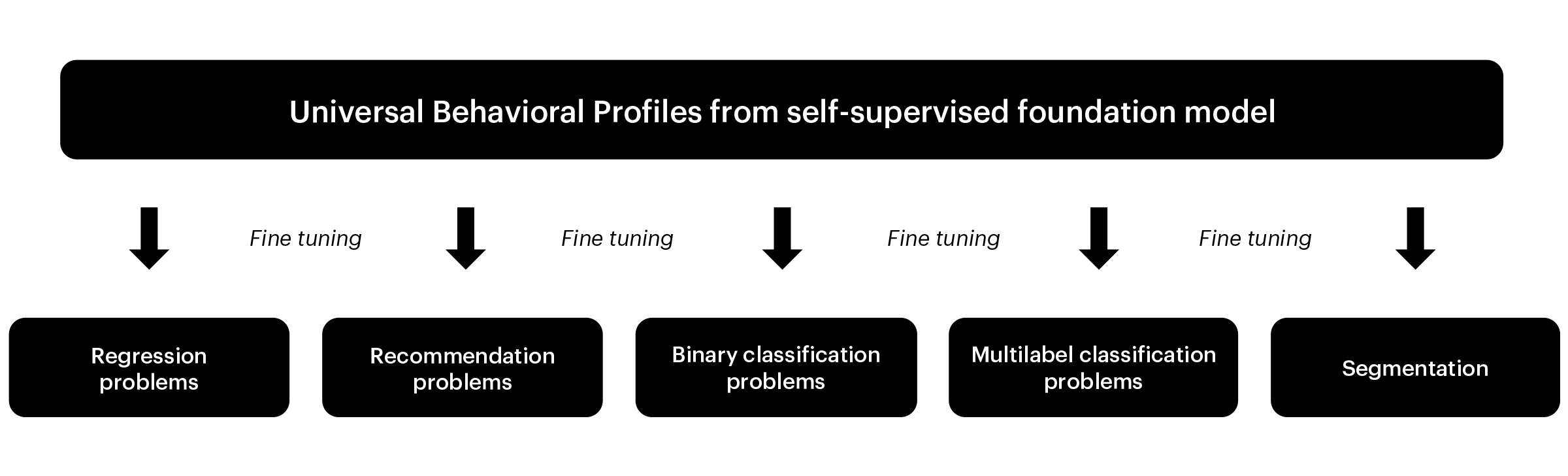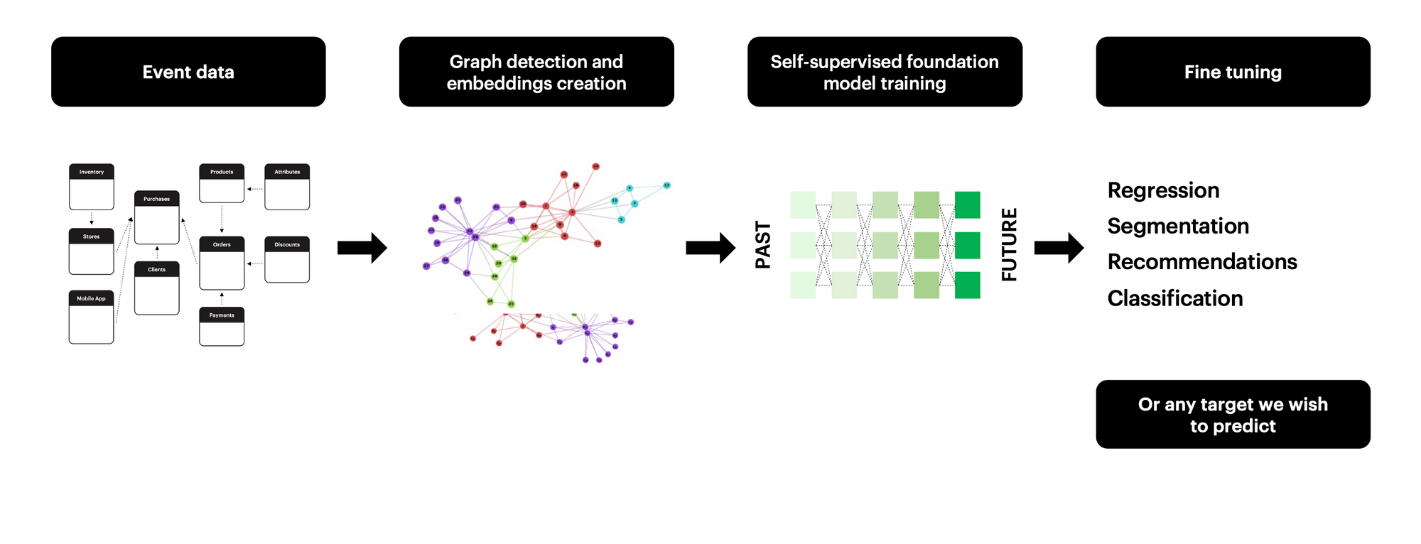 We can then fine-tune the pre-trained foundation model for many different tasks. In the recommendation task, we predict which products customers will buy. For churn prediction, we estimate which customers are likely to become inactive in the near future. We can also predict if the user will buy a given product, use services of some category, purchase something of a given brand, and so on.
