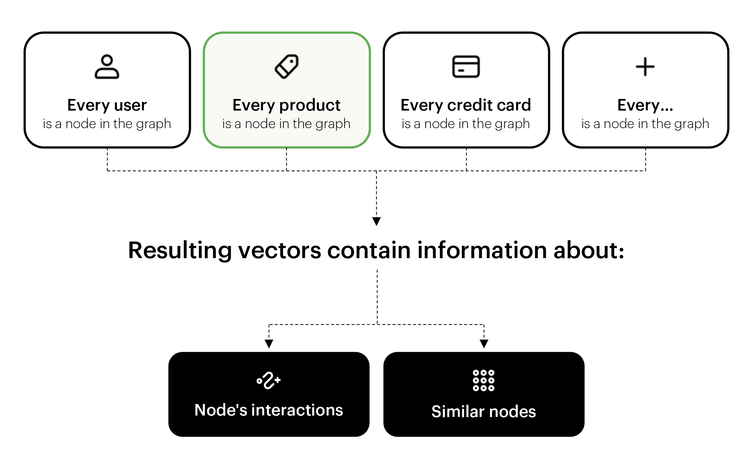 Graphs are very potent when it comes to representing real-world events and, as such, are particularly well fitted to user interaction data. Nodes can represent users, products, services, transactions or even product categories, prices, basically anything from our data that can be interpreted as an entity. Edges can represent relations between any two or more entities: user bought product, user followed user, user spent given amount of money, the product was bought together with other product, etc. For that reason, the first stage of the BaseModel pipeline is to look for graphs in event data and convert them into vectors – graph embeddings. We use our proprietary algorithm, Cleora, that transforms raw data into ML-interpretable vectors that are based on graph data structure and contain information about node’s interactions and similarity. A detailed description of the algorithm can be found here.
