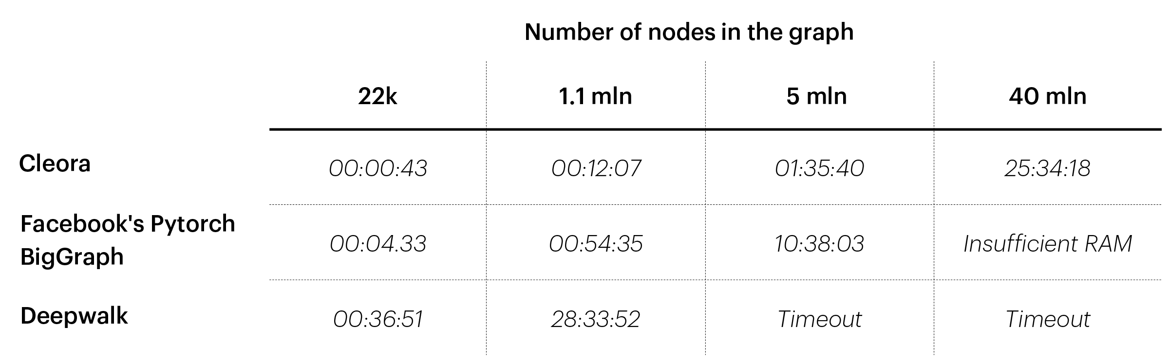 Making Cleora ultra-fast and scalable was of great importance to us as we deal with large amounts of data in industries like retail, banking, or telco. Graph Neural Networks, which are the most popular graph embedding approach, require many GPUs and tremendous engineering effort to scale with huge event data graphs. Cleora can work on a single GPU and takes a few minutes to process graphs with as many as 1 million nodes.