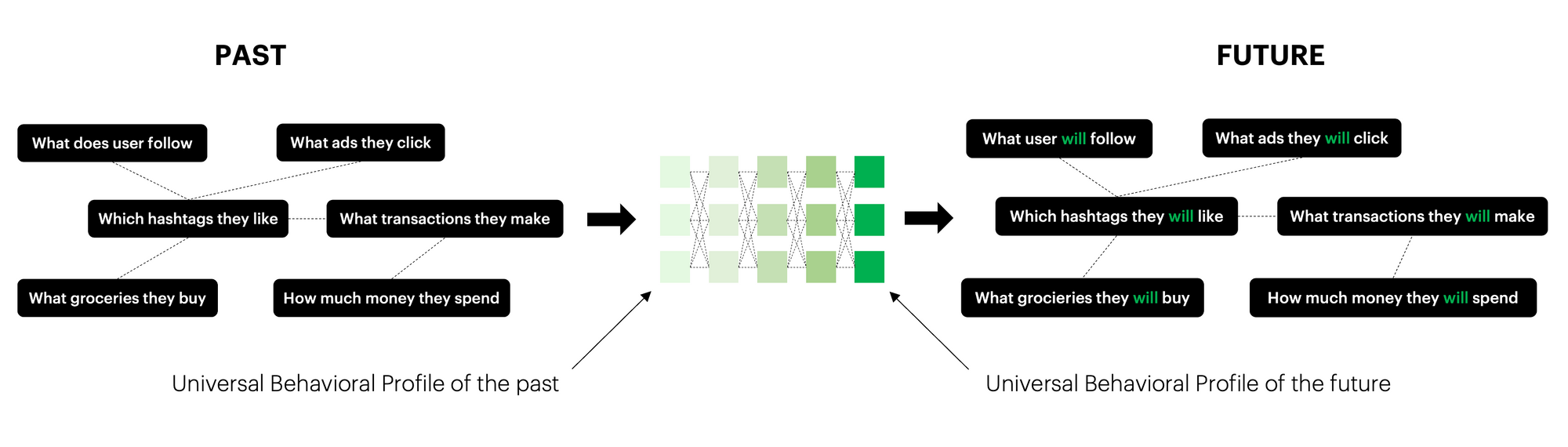 Now we can connect all introduced concepts to uncover the true power of BaseModel. Universal behavioral profiles can be used to train a neural network to predict future interactions. To do so we can utilize a self-supervised training technique by predicting future continuation of the data based on available history.