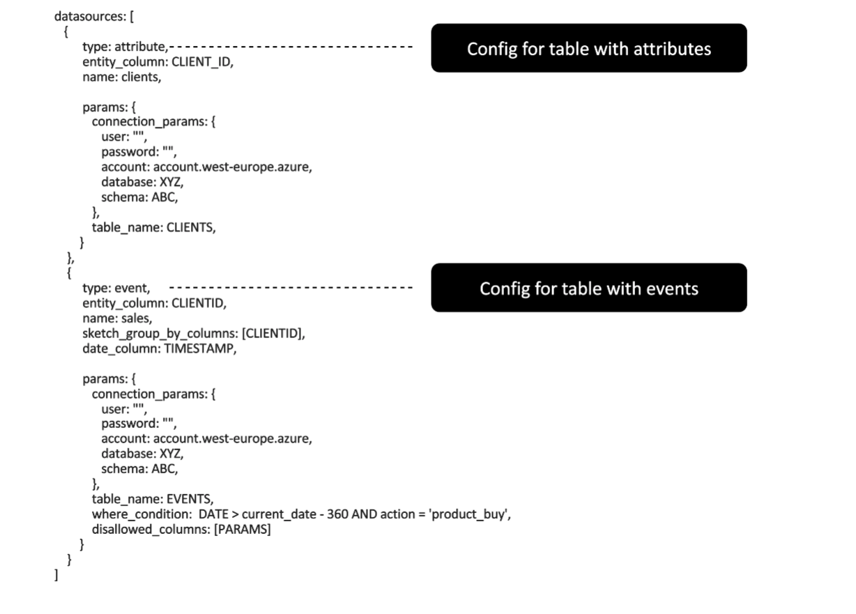 But how does it look in practice? First, BaseModel retrieves event data from a database (e.g., ClickHouse, Snowflake, Redshift, BigQuery). The next step is the fit phase where we create functions that transform input data into behavioral profiles. We define what kinds of events and attributes we want to use and how to group them. For example, we can group product buys by customer. This way users are represented in terms of products they bought, and products are encoded to keep the notion of similarity as being bought by the same user. Analogically, we can group card transactions by user, products by session, and so on. As you can see, we have very easy fit phase configuration resulting in complex entity representations, with all the graph-based behavioral profiling magic going under the hood. What is important about the fit phase is that instead of storing hundreds of features per entity, we store small helper data structures and functions created based on provided data, that instruct how to transform them into features.