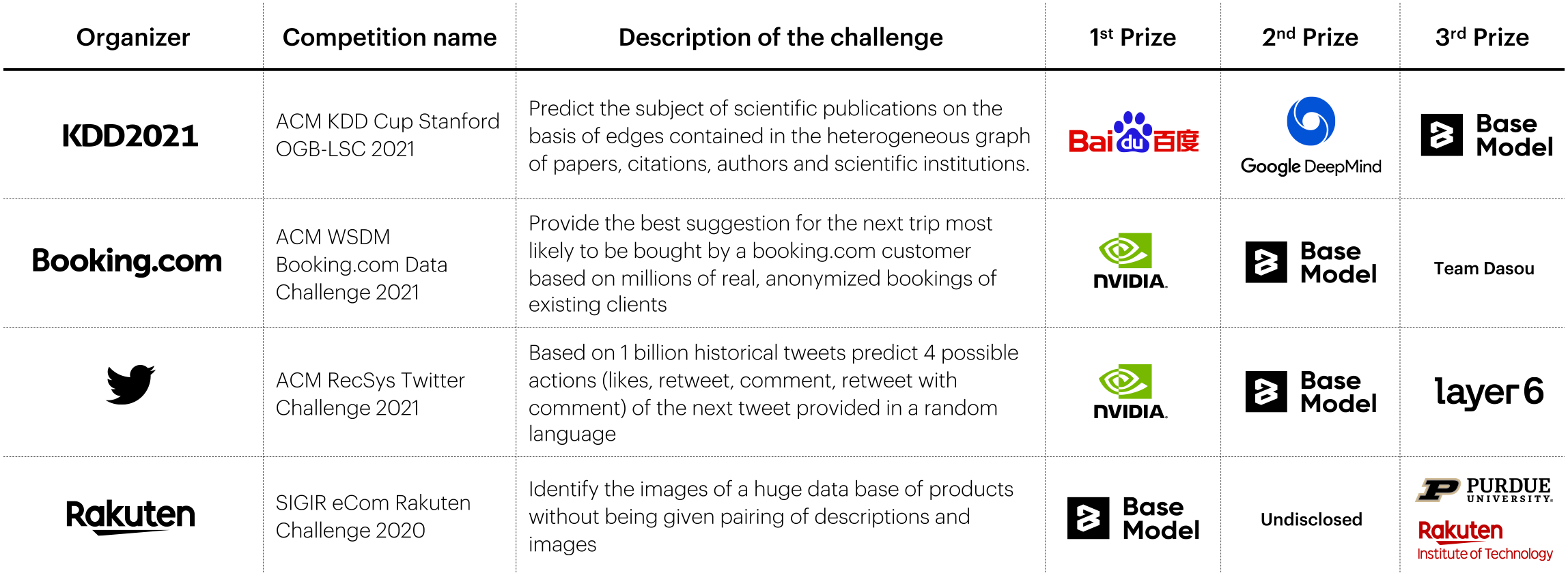 Of course, these are only selected examples of what can be done with BaseModel, but in fact, methods used here are very universal. Taking part in many competitions, we tested Cleora+EMDE behavioral profiles in various tasks from different domains such as next destination prediction on Booking.com data, scientific papers subject area prediction on a large graph dataset, near real-time Tweets recommendation, or matching a product image to the description. In each of these tasks, we were in the top three together with big research labs like NVIDIA or DeepMind.